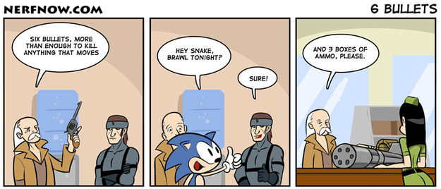 I'm glad to finally have a break from the Dota and all, but this just...Wasn't funny. What would Sonic and Snake being in Brawl have to do with Ocelot buying a Gatling gun? It's like the punchline got lost on it's way to a completely different joke and ended up here.
