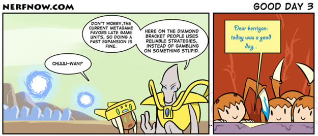 Out of the 3 "good day" comics, i found this the least entertaining. and not because of the game associated, but because the joke in this one is one that anyone with basic knowledge of the game understands, whilst the other two needed a bit of explanation. the zerg rush joke is very well known