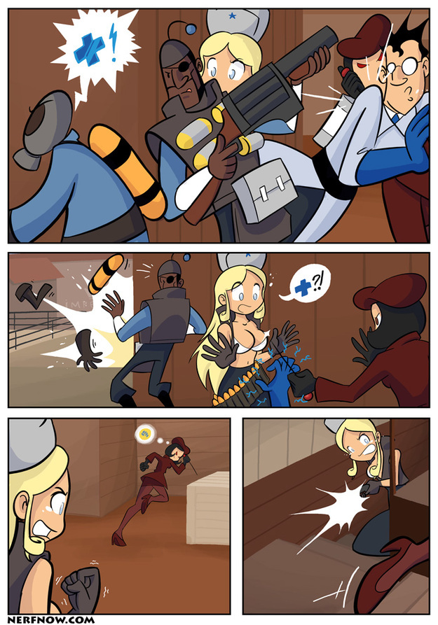 that first panel is a total mess. Seriously, what the hell is going on with that Demo/Medic shared leg? Has some serious mutation occured? Also, Heavy-tan is a disembodied head. o_O