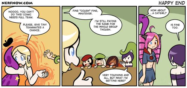 Hooray, everyone's happy! Jo got harem, Heavy got friends, the rest is not meeting its slimy demise in the hole of naughty tentacles, and the cat looks fine too.