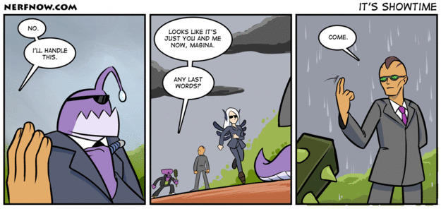 Antimage here is telling slardar to let him take Faceless man-to-man. That blue-handled something that Slardar's pulling out is a "Blink Dagger" which lets him teleport, implying he's about to make a move on Faceless.