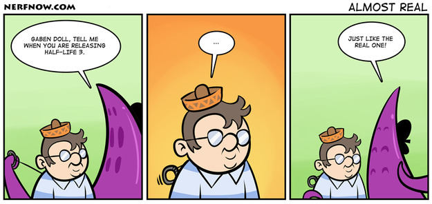 Has anyone noticed that there are THREE dots in the second panel's text bubble? Wake up, sheeple! HL3 is confirmed in probably never....