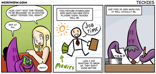 [url=#user_comment_346047]@Raxyz[/url]: Techies isn't broken. He's just annoying. All he does is leave invisible traps that blow up in other people's faces when they step on them. That, and blow himself up for massive damage. He's not actually good, though, since he can't contribute anything to anything. Even Icefrog hates him.