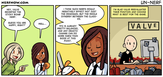 So Valve guy reversed the nerf because he was scared of getting blown up by the stickies. BUT, ironically, the stickies wouldn't have hurt him very much before he reversed the nerf. PLUS, if he was afraid of them, couldn't he just nerf them even more?