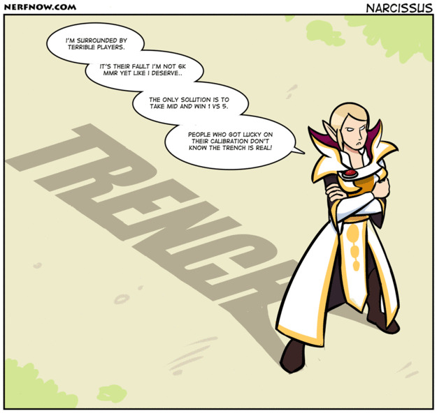 So uh, I get the general idea of the comic, but the joke loses a lot of impact because I have no idea what "trench" is in this context. That happens to me with a lot of DOTA jokes. I miss Engy. :(