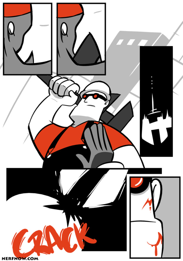 Hm. The first two panels should probably each be mirrored, since that shows him drawing his wrench left handed, but suddenly he's swinging it right handed.