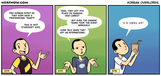 Korean people mainly play LoL. I'm not sure if DoTA is installed in most Korean Internet Cafes, and I quote my friend: "If you play DoTA in Korea, you get bashed up." Korean teams are god-tier in LoL but DoTA in Korea is just not as competetive.