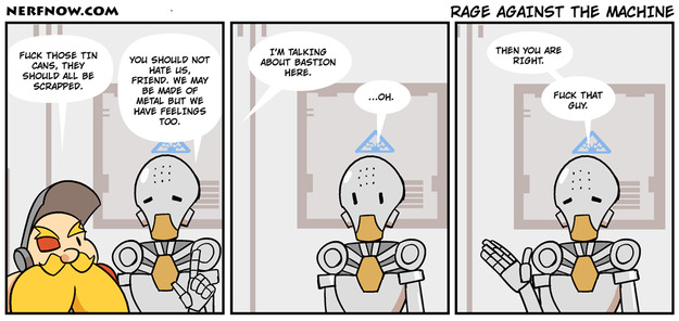 If you treat Bastion like a TF2 sentry gun for a bit, then you realize he has most of the same weaknesses and strengths, and thus balanced unless you play W+M1, in which case natural selection says you deserve said death.