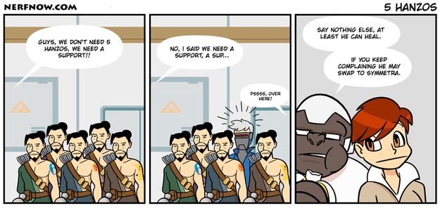 Don't be ridiculous. Why would you need a healer with four Hanzo and one Tracer? Clearly the only appropriate course of action is to hope the other team is also in full Hanzo mode and you can solo the objective while they're busy playing dragon pong.