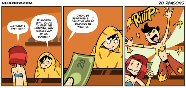 Late to the party here but I'd just like to point out that from this comic one can infer that Morgan's genie uniform should have yellow pants and a blue top.