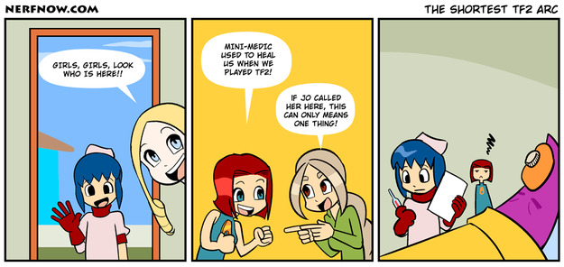 @Ian Murdoch: Although it's been a few months, http://www.nerfnow.com/comic/2266 was the most recent time I remember the girls wearing their TF2 gear - not quite "ages" ago. ;)