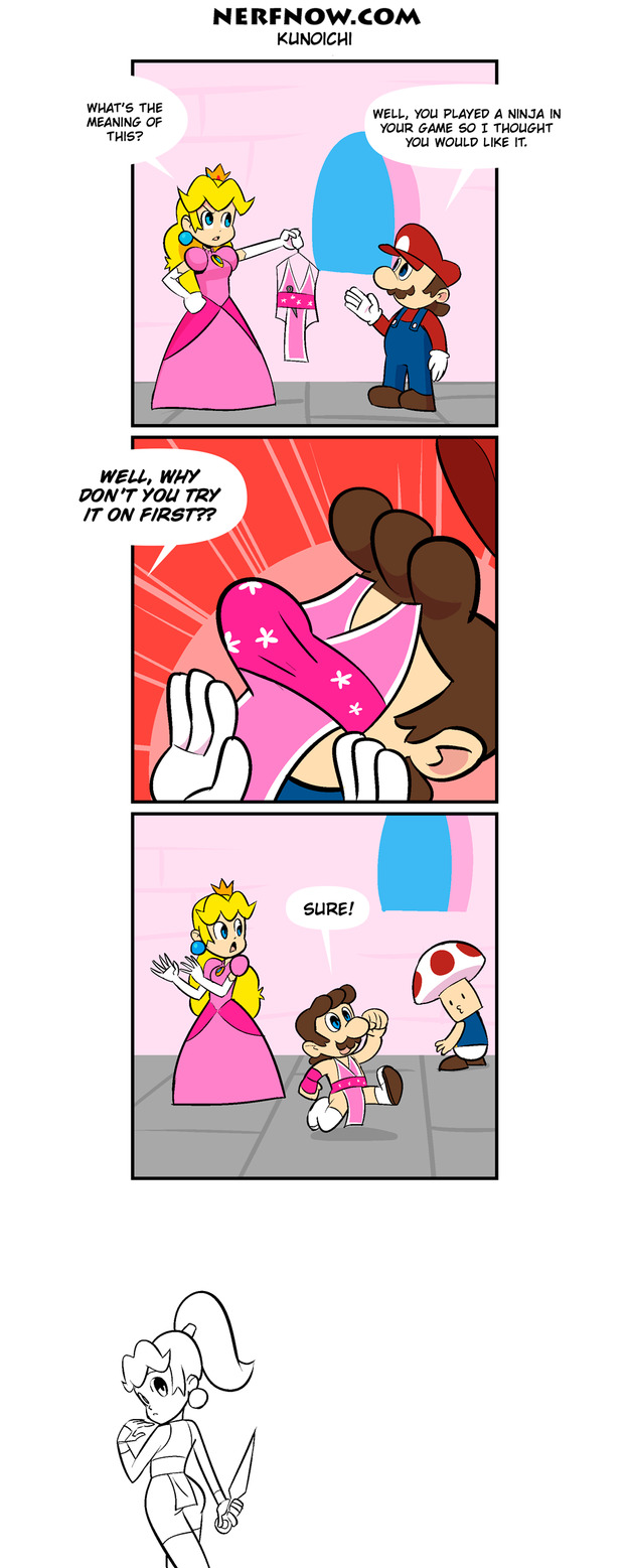 We all knew this was going to go down a DOA route... And who wouldn't love to see Peach wearing a tiny pink and white version of Kasumi's white ninja outfit.
