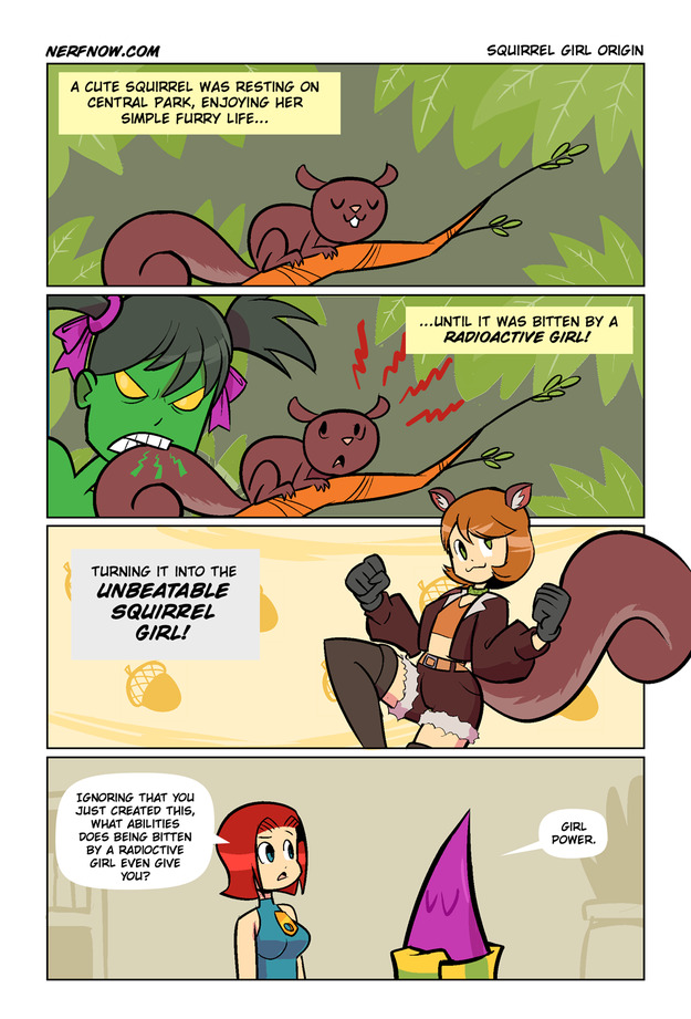 Human-level intelligence, massive size (for a squirrel), and opposable thumbs all seem like powers a squirrel might hope to gain from being bitten by a radioactive girl.