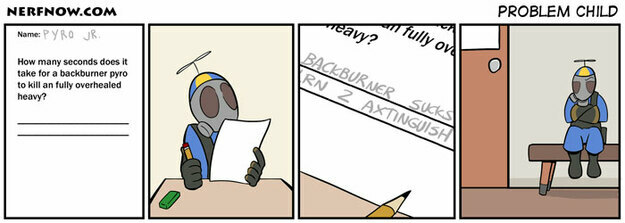 I don't know if anyone noticed this, but Panel three makes no sense. You can axtinguish with the backburner just fine. Perhaps she meant "Backburner sucks Lrn 2 airblast"?