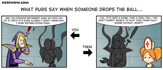 World of Warcraft: PUG = Pick Up Group you can que for them there completely random.... This is so true!