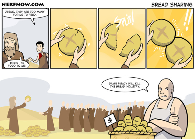 The hilarious (not) thing is that nowadays this could almost certainly happen. Monsanto has patented the DNA of the grain they produce. If Jesus had multiplied bread that had been made with flour milled from Monsanto wheat, you bet Monsanto would try to sue.