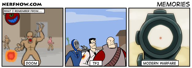 Because this comic is him complaining about iron sights rather than shooters "evolving" into stale, one-dimensional gameplay.