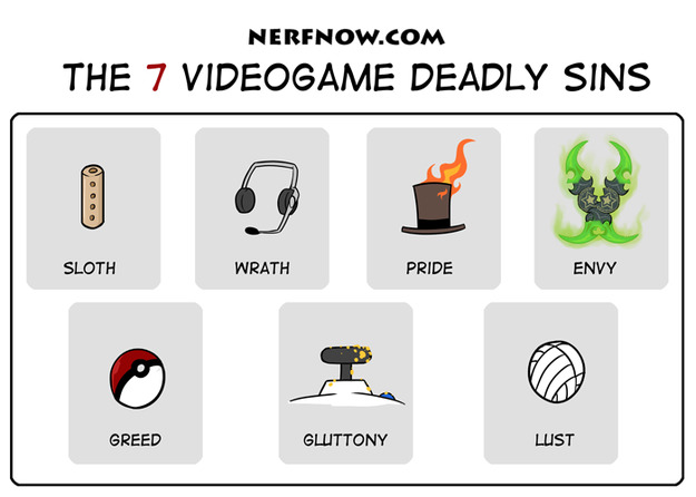 sloth: mario 3 flute for skipping levels, wrath: CoD headphone rage, pride: tf2 unusual hats, envy: rare wow item drops/crafts, greed: pokemon collecting, gluttony: a 360 control with crumbs, representing eating while playing, and the ball: the doa volleyball spin-off, an extreme doa fanservice game