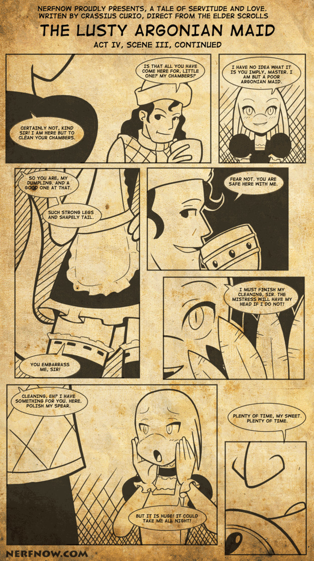 Technically the Argonian is all his, not any of yours, or mine. If Jo makes the comic like this then it automatically means the person having his "spear polished" gets the girl doing the deed.
