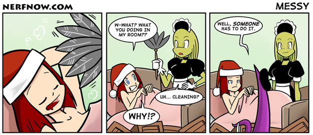 So we've got the naked girl wearing a santa hat, the non-human female in the french maid outfit, boxes everywhere, and a big purple talking tentacle.