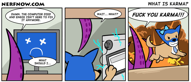 Soooo....karma is represented by a dog? (Is it a he or she btw, it got both tie and bow :0 )