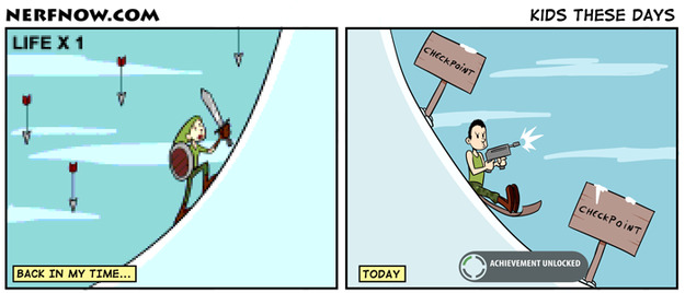 I love today's comic because of how true it is. The first games were tough: no checkpoints at all sometimes, increasingly challenging, not as many options, and you had to be VERY precise with movements. I still love classic games though even if the new ones offer better graphics and look better.