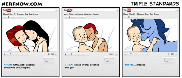[url=#user_comment_120943]@Anon[/url] is a Bigot: And how much love do you think lesshep gets from girls? We're all so approving of that because (random guess zomg) 90% of the commenters here is male. Not to speak of the male percentage of ME players/Youtube commenters.