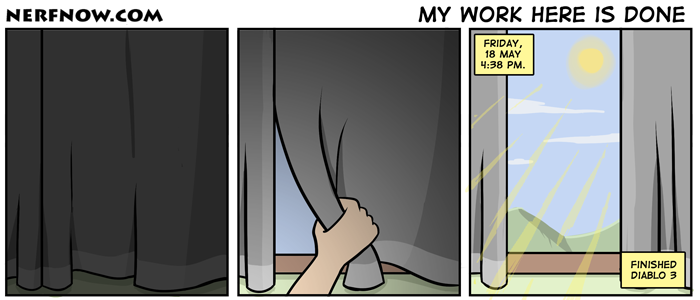 Diablo was a chance to go hardcore on a game, or more hardcore than I usually go. It was nice to dedicate myself to finshing it but it's also good to know I'm done with it and now I can just enjoy the long road to Inferno mode at a more slower pace.
