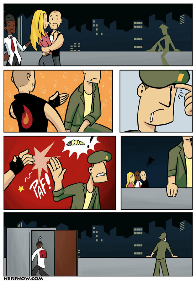 The soldier will be all baddass, but then he will be fucked around, then the pyro comes along and helps him up and heals him, then he'll be like "You're alright, doc!"