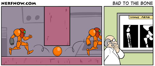 Doctor: Even with all your acrobatics and rolling, Samus, I've seen worse cartilage in bones.