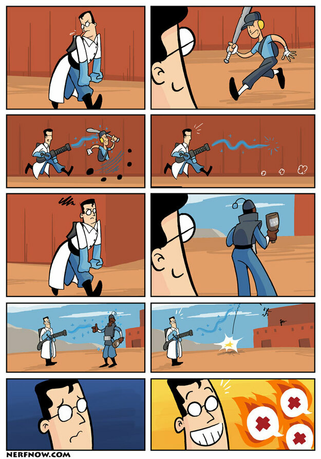 Oh god, I fucking hate it when Soldiers or Demomen call for medic and then blast jump AND KEEP CALLING FOR MEDIC!Engie needs to make meic a rocket pack so he can keep up with his teammates better.