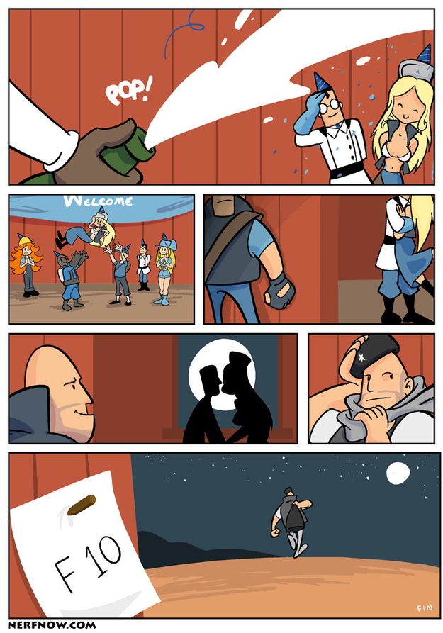 He should make a slipt comic, the BLU people having a party in their respawn, and the HMguy walking over to the Red respawn with a angry face and a lust for revenge.
